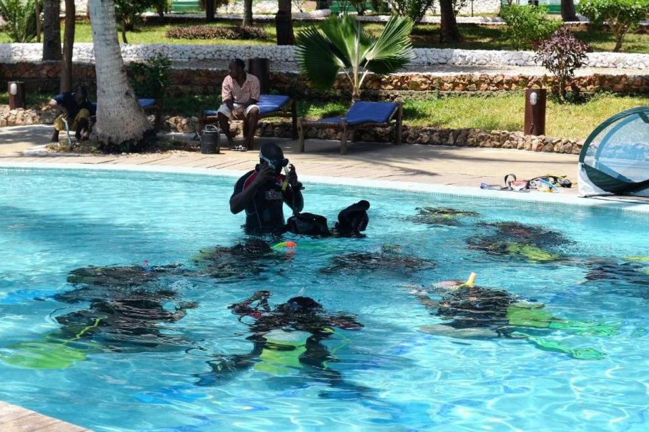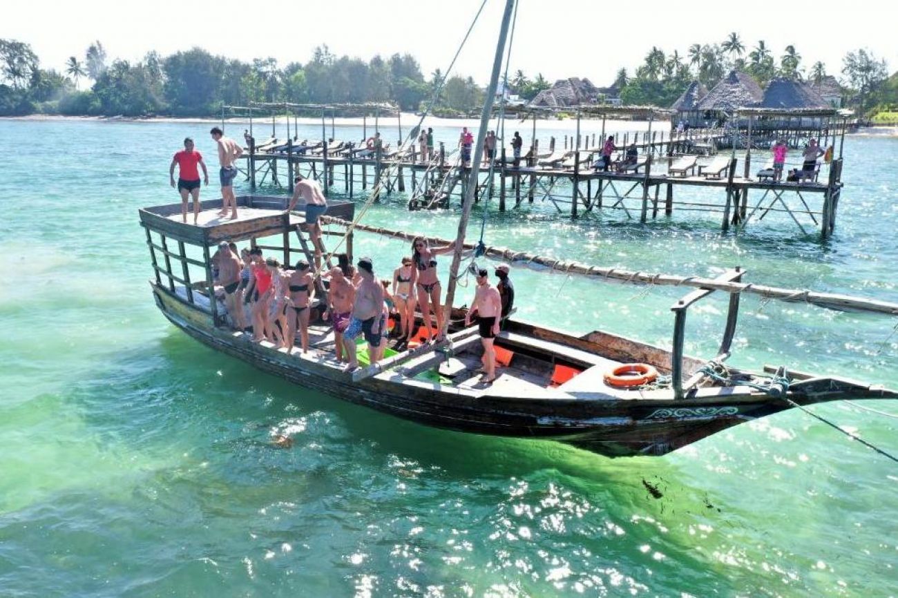 След пристигането ни в рибарското селище Кизимкази се качваме на моторна лодка и навлизаме в чистата вода, за да открием морските обитатели. Ако имаме късмет, можем само след 5 до 10 минути да видим делфини. Тези симпатични морски обитатели са весели, интелигентни и често с удоволствие играят с хората. След като плуваме с тях, отиваме в плитки води за гмуркане с шнорхел, преди да се върнем на плажа.