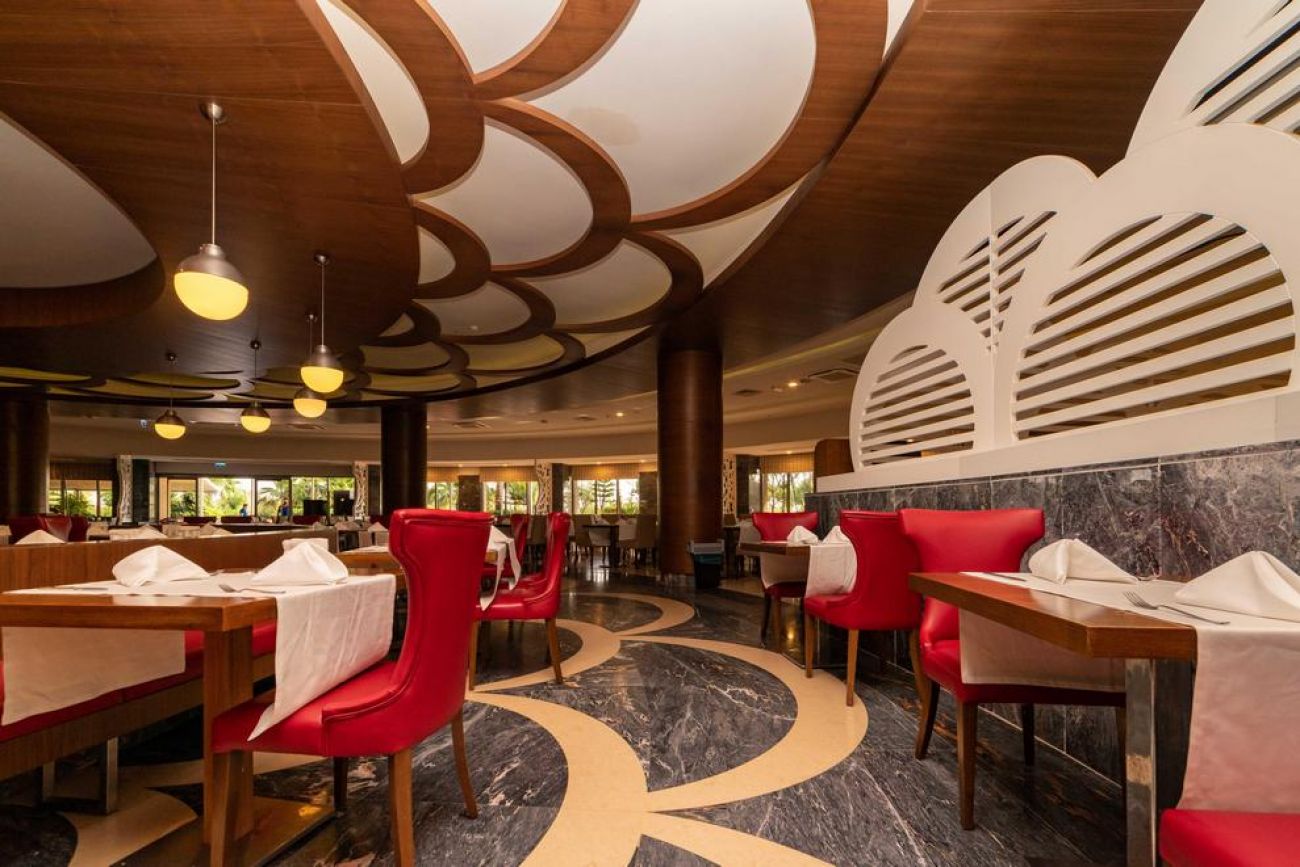 В основния ресторант се сервират закуска, късна закуска, обяд, вечеря (деца и диетично меню) и нощна супа като отворен бюфет. Капацитет: 700 души, капацитет на терасата: 1000 души. В а`ла карт ресторантите се сервират вкусна османска, италианска, морска, мексиканска и китайска кухня. Всеки от 5-те а`ла карт ресторанта може да се използва безплатно само веднъж седмично, при условие че се направи предварителна резервация. Тези ресторанти и техните възможности са както следва: Османски ресторант Капацитет: 75 души; Капацитет на италиански ресторант: 50 души (01 юни - 30 септември); капацитет на китайски ресторант: 60 души;капацитет на рибния ресторант: 60 души (01 юни - 30 септември);капацитет на мексикански ресторант: 60 души (01 юни - 30 септември). Гостите на хотела могат да се насладят на любимата си напитка в лоби бар, снек-бар, бар на басейна, плажен бар, диско бар и витамин бар (платен).