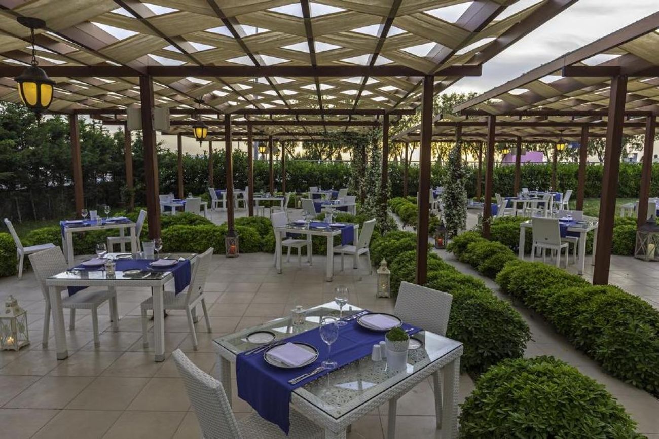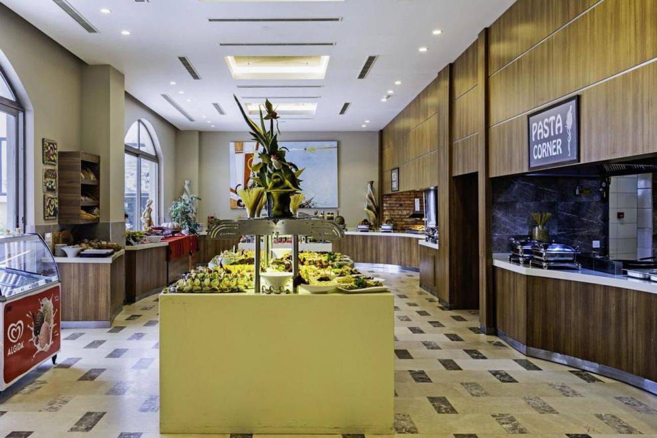 Ресторант Амбър е целодневен ресторант, в който се сервират разнообразни турски и международни ястия. Гостите могат да се насладят на закуска, късна закуска, обяд и вечеря на блок маса от 07:00 часа до 21:30 часа всеки ден. С места за сядане на закрито и на открито. Работно време: Закуска: 07:00 - 10:00 часа; Късна закуска: 10:00 - 11:00 часа; Обяд: 12:00 - 14:30 часа; Вечеря: 18:00 - 21:30 часа; Нощен бюфет: 22:00 - 07:00 часа. Специализираният ресторант Culinarium & Finoccio предлага серия от световни кухни. Те включват средиземноморски, егейски, италиански и турски ястия. Вечеря: 19:00 - 21:30 часа. Аngels Bar е лоби бар, който предлага богат избор от коктейли във фоайето. Това е модерен закрит бар, където гостите могат да се отпуснат при пристигането си с избор на кафе, вино или спиртни напитки. В определено време в близост до лоби бара се сервира кафе и сладкиши. Слънчев бар се намира при басейна и предлага богат избор от леки закуски и коктейли. Менса бар и ресторант е снек-бар и ресторант, където се предлага богат избор от леки закуски и освежаващи напитки. ULTRA ALL INCLUSIVE - закуска, обяд, вечеря и междинни хранения на блок маса; местни алкохолни и безалкохолни напитки - без лимит (съгласно концепцията на хотела).