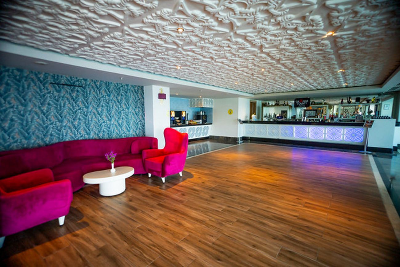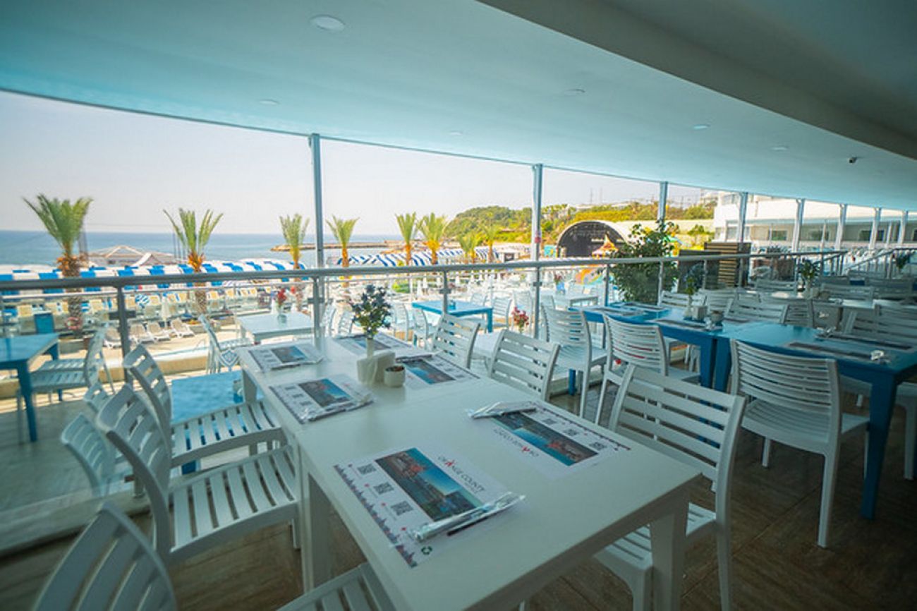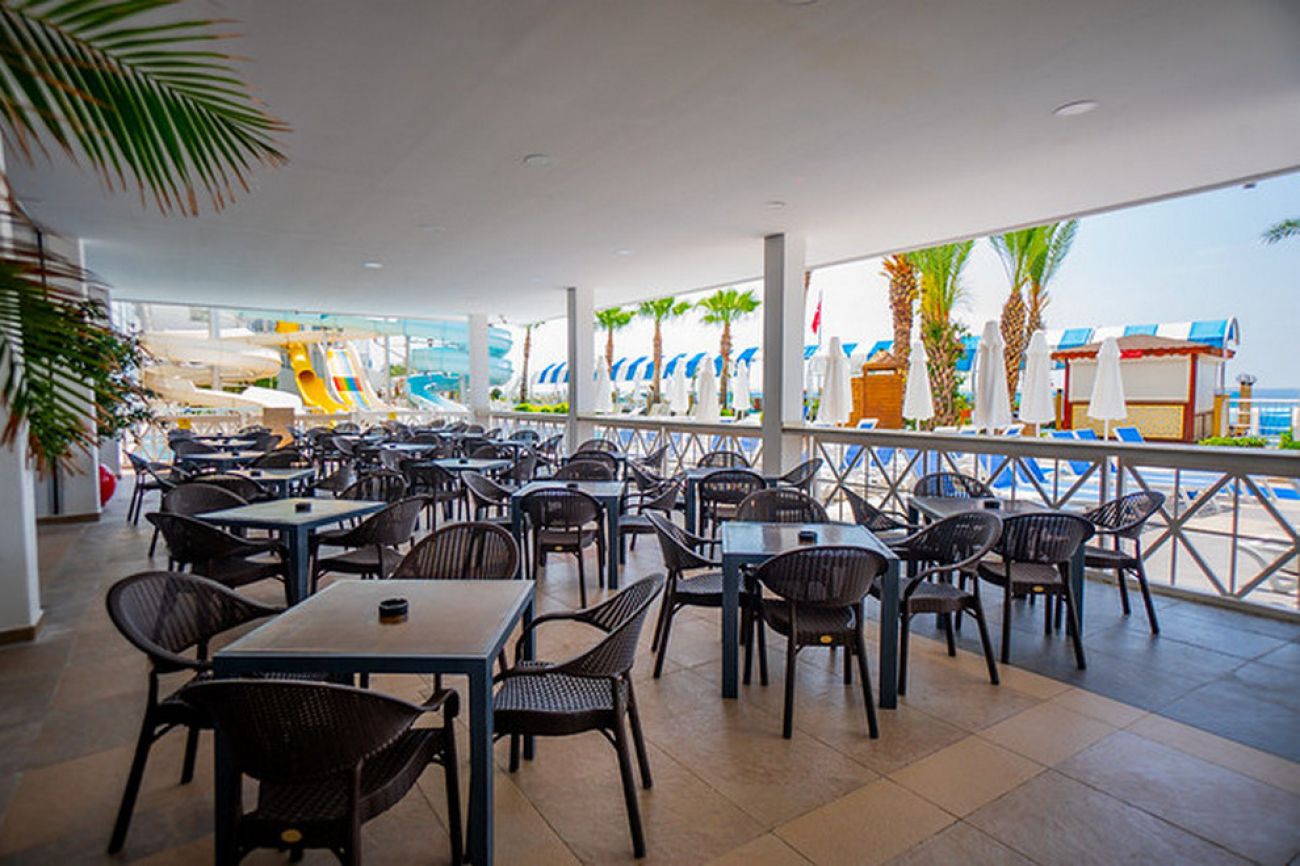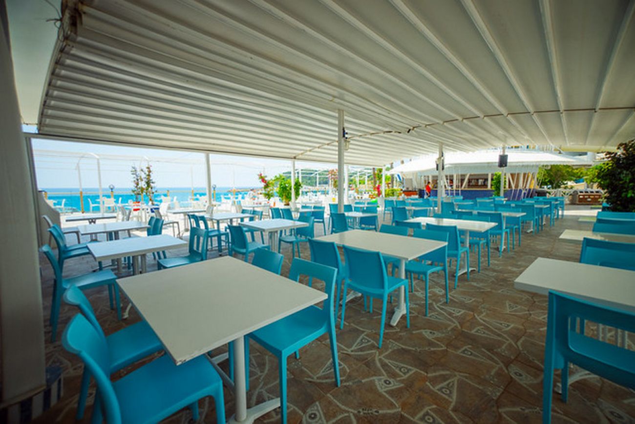 Собствен пясъчно-чакълест плаж и платформа с бар, който работи 10:00-18:00 ч. и 21:00 - 00:00 ч. На разположение на гостите има 5 басейна, два от които детски, 4 пързалки. Чадъри и шезлонги на плажа и при басейна се ползват безплатно. Плажни кърпи – срещу депозит.