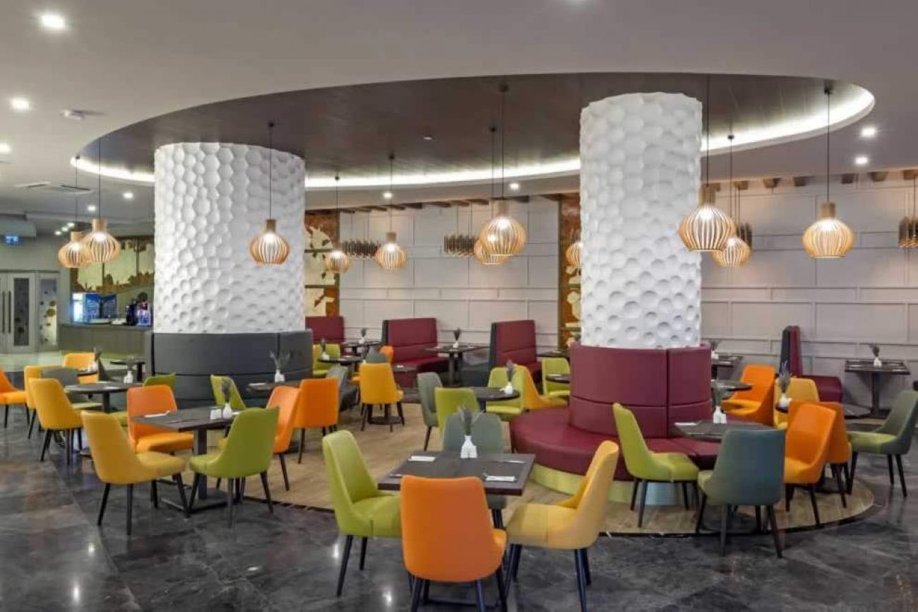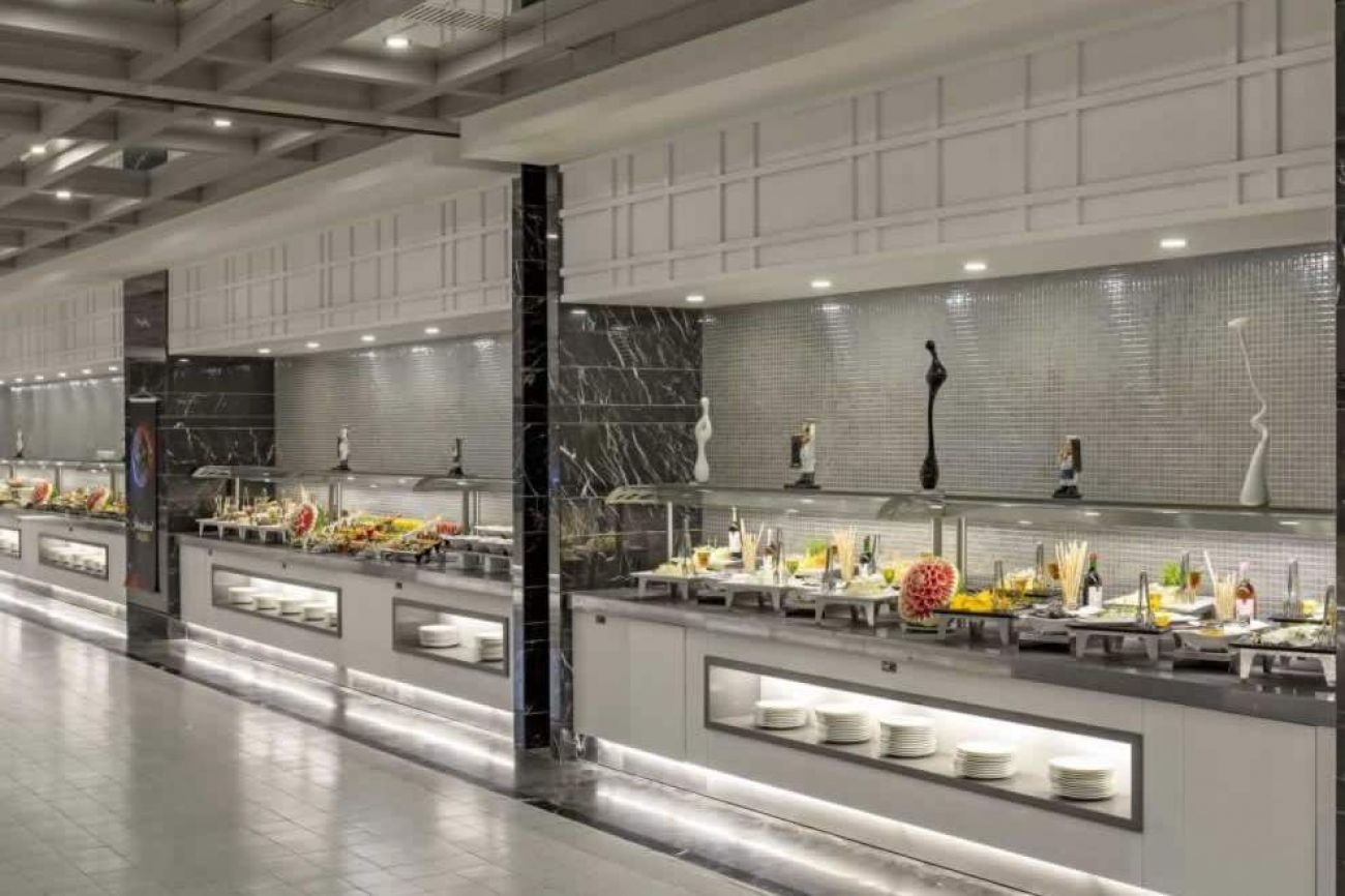 На разположение на гостите е основен ресторант с детско и диетично меню. А`ла карт ресторантите: италиански, османски, рибен, далекоизточен, стек ресторант, мексикански, суши, испански и японски ресторант, които работят от 18:30 до 21:30 ч., с предварителна резервация. Освежаващи напитки и закуски се поднасят в баровете: Amphi бар (10:00-23:30 ч.); Sunset бар на кея (10:00-18:00 ч.); Stella Snack бар (10:00-16:00 ч.); Capella лоби бар (денонощно); Skyline лоби бар (10:00-00:00 ч.); Solaris Pool бар (10:00-00:00 ч.); Gamezone бар (16:30-00:00 ч.); Galaxy диско бар (23:45-02:00 ч.) и Аctivity бар (10:00-20:00 ч.). Ultra All Inclusive, която включва закуска, обяд и вечеря на блок маса, богато разнообразие от междинни закуски, както и неограничена консумация на местни и някои вносни алкохолни и безалкохолни напитки - 24 часа в денонощието.