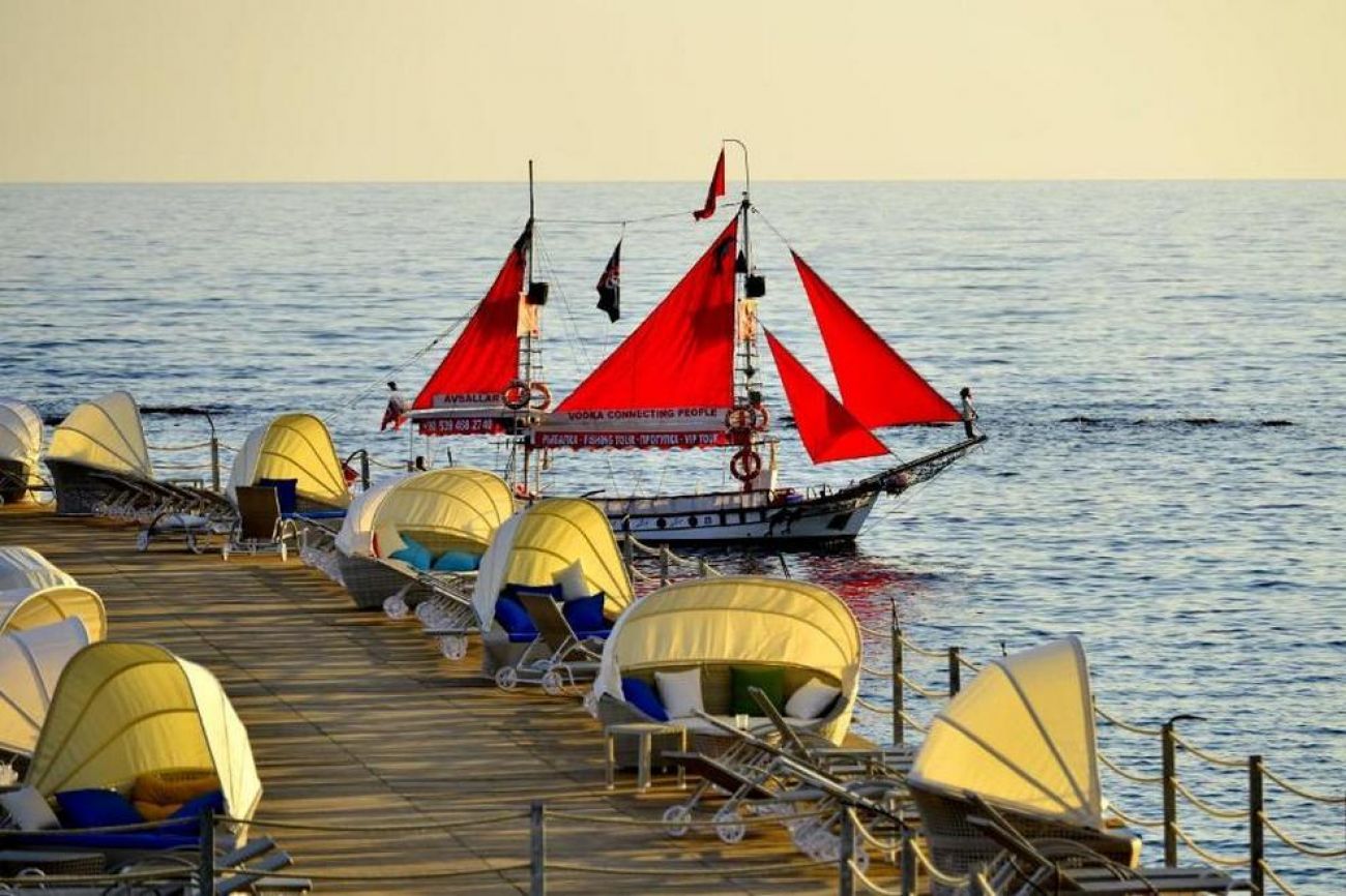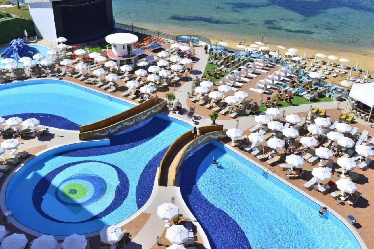 Собствен пясъчно-чакълест плаж с платформа, бар на плажа. 3 открити басейни, аквапарк, закрит басейн. Чадъри, шезлонги и матраци на плажа и при басейна се ползват безплатно, плажни кърпи – срещу депозит.