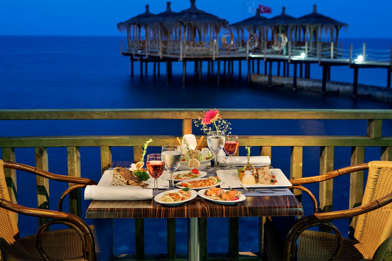 Crystal Flora Beach Resort разполага с един ресторант, вегетарианско меню, пет а'ла карт ресторанта - рибен, мексикански, италиански, турски. Освежаващи напитки и закуски се поднасят в Lobby Lounge Bar, бар на плажа, бар при басейна, диско бар и Garden Pub.