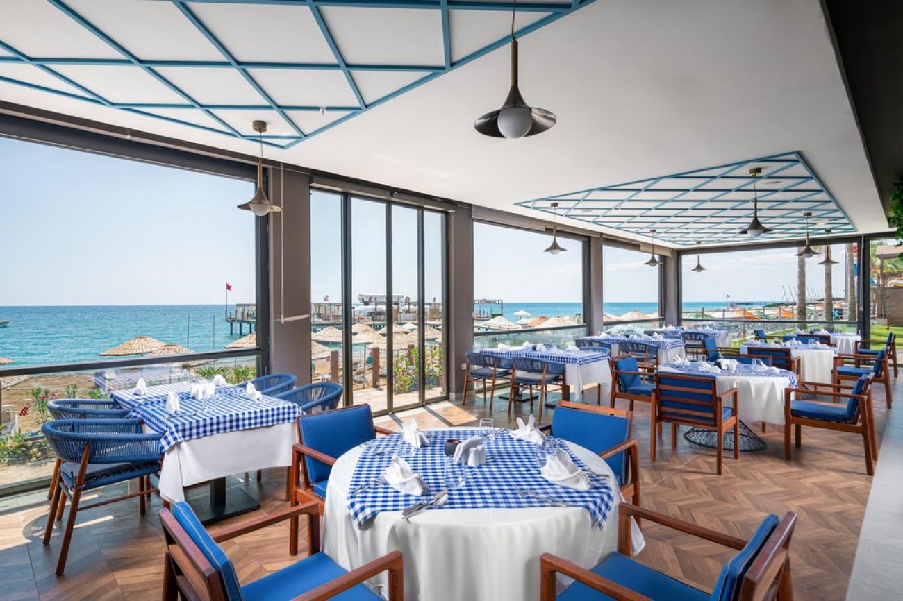 Собствен пясъчно-чакълест плаж, дълъг 200 м. Разполага с открит басейн, закрит басейн, 3 водни пързалки. Чадъри, матраци, шезлонги, плажни хавлии с ползват безплатно. Кабаните на плажа и кея - срещу заплащане.