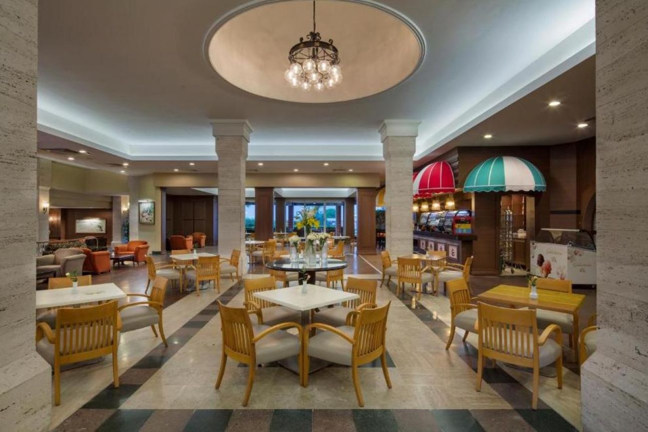 На разположение на гостите са основен ресторант и три а`ла карт ресторанта: турски, средиземноморски и рибен. Освежаващи напитки и закуски се поднасят в 9 бара: Лоби бар - 24 часа в денонощието, Бар на басейна 10:00-18:00 ч., Бар на плажа 10:00-18:00 ч., Бар на аквапарка, Чайна и кафе 10:00-00:00 ч., Ботанически бар 10:00-18:00 ч., Бар Nautilus 10:00-00:00 ч., Ирландски бар 16:00-01:00 ч., Диско бар 22:30-02:00 ч.