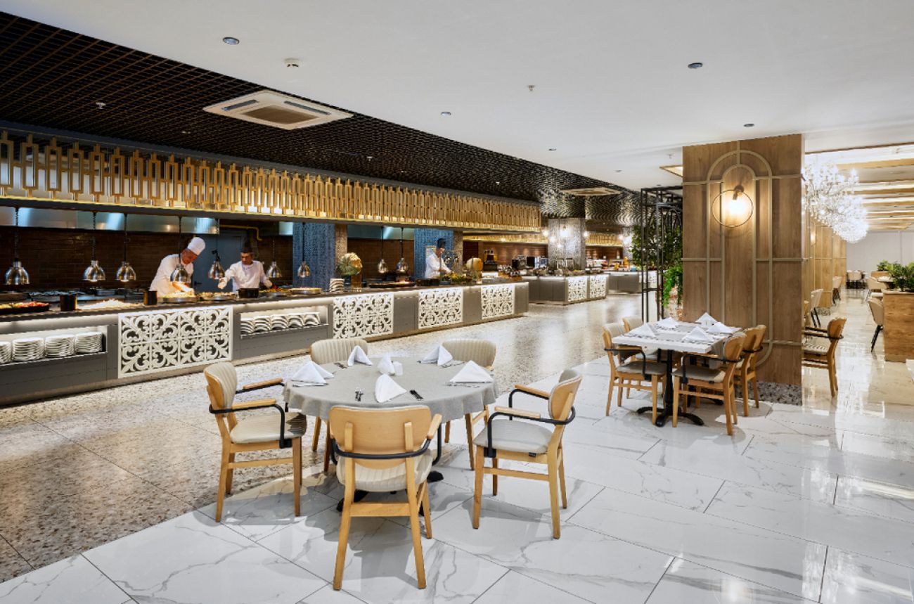 На разположение на гостите са основен ресторант, 4 а`ла карт ресторанта: италиански, kebab house, рибен и китайски (1 безплатно посещение на един от ресторантите - с предварителна резервация), бистро (от 21 ч.-07 ч.). Освежаващи напитки се предлагат в 5 бара, снек бар, гьозлеме пекарна, сладкарница.