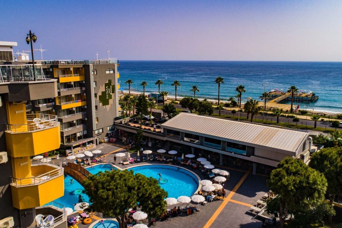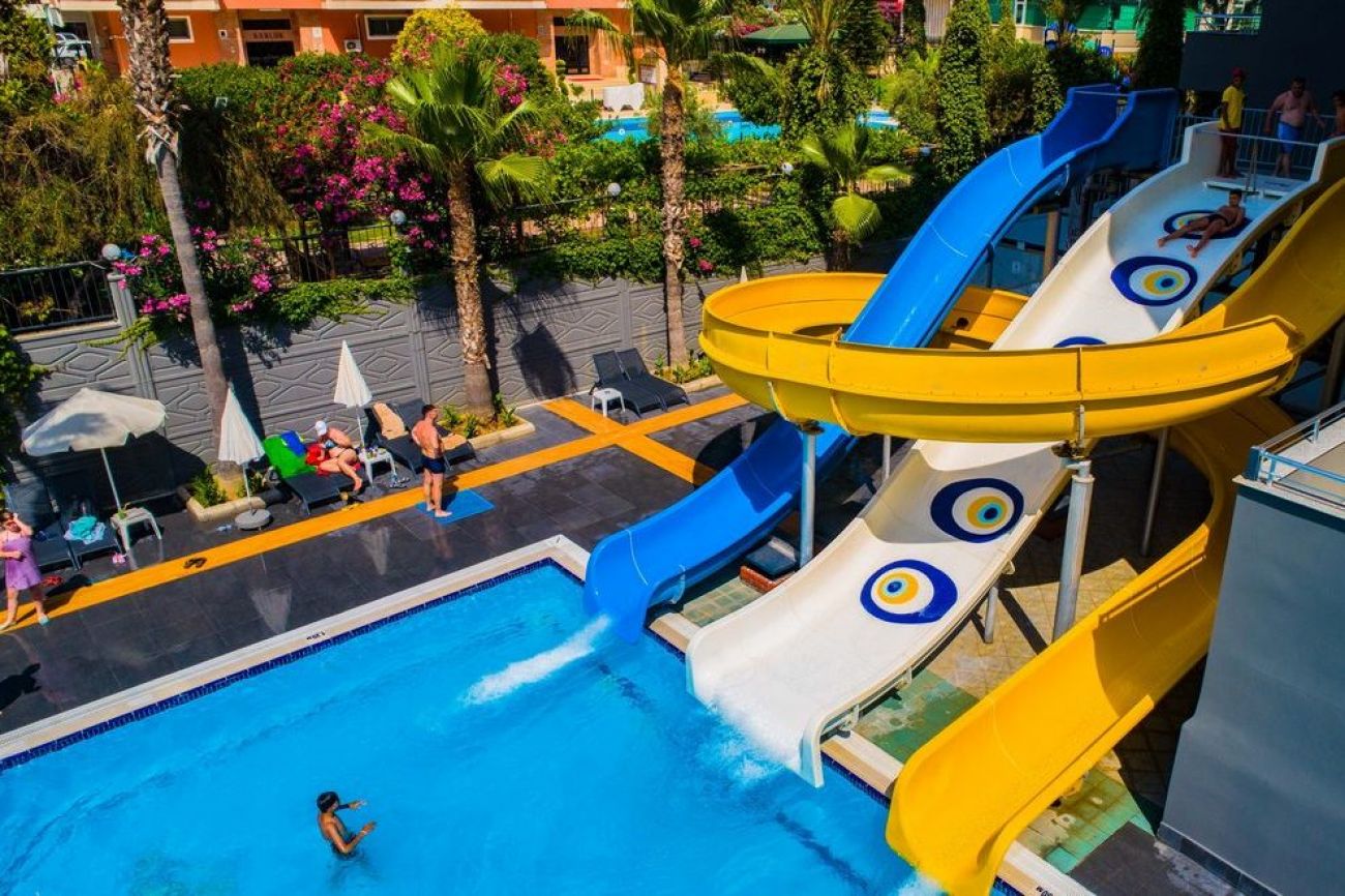 Хотелът разполага със собствена пясъчно-чакълеста плажна ивица с кей, с открит басейн, втори басейн с три водни пързалки, детски басейн с водни пързалки, закрит басейн. Безплатно ползване на чадъри и шезлонги на плажа и при басейните. Плажна кърпа можете да ги вземете от турската баня между 08:00 и 17:00 часа.