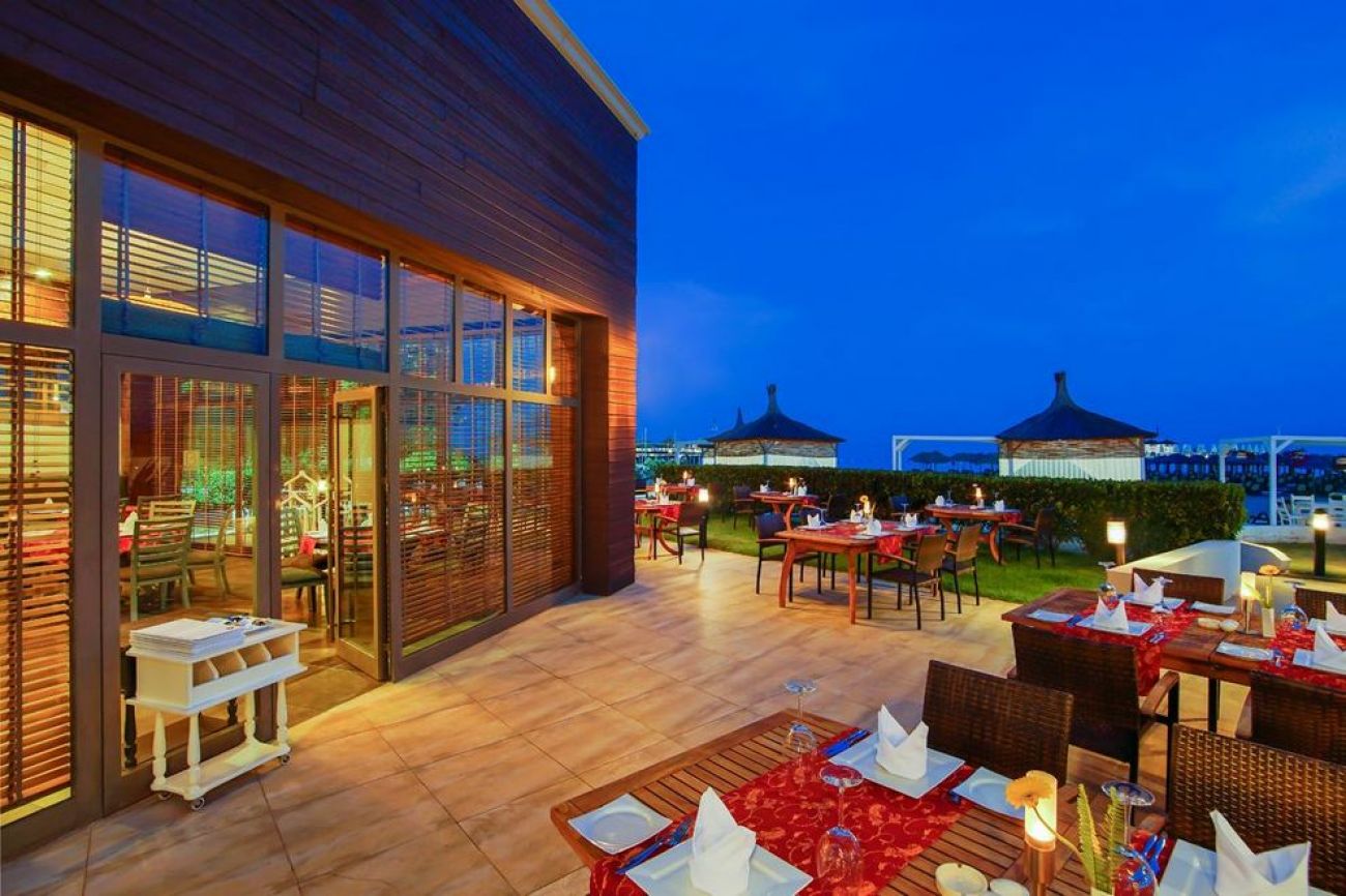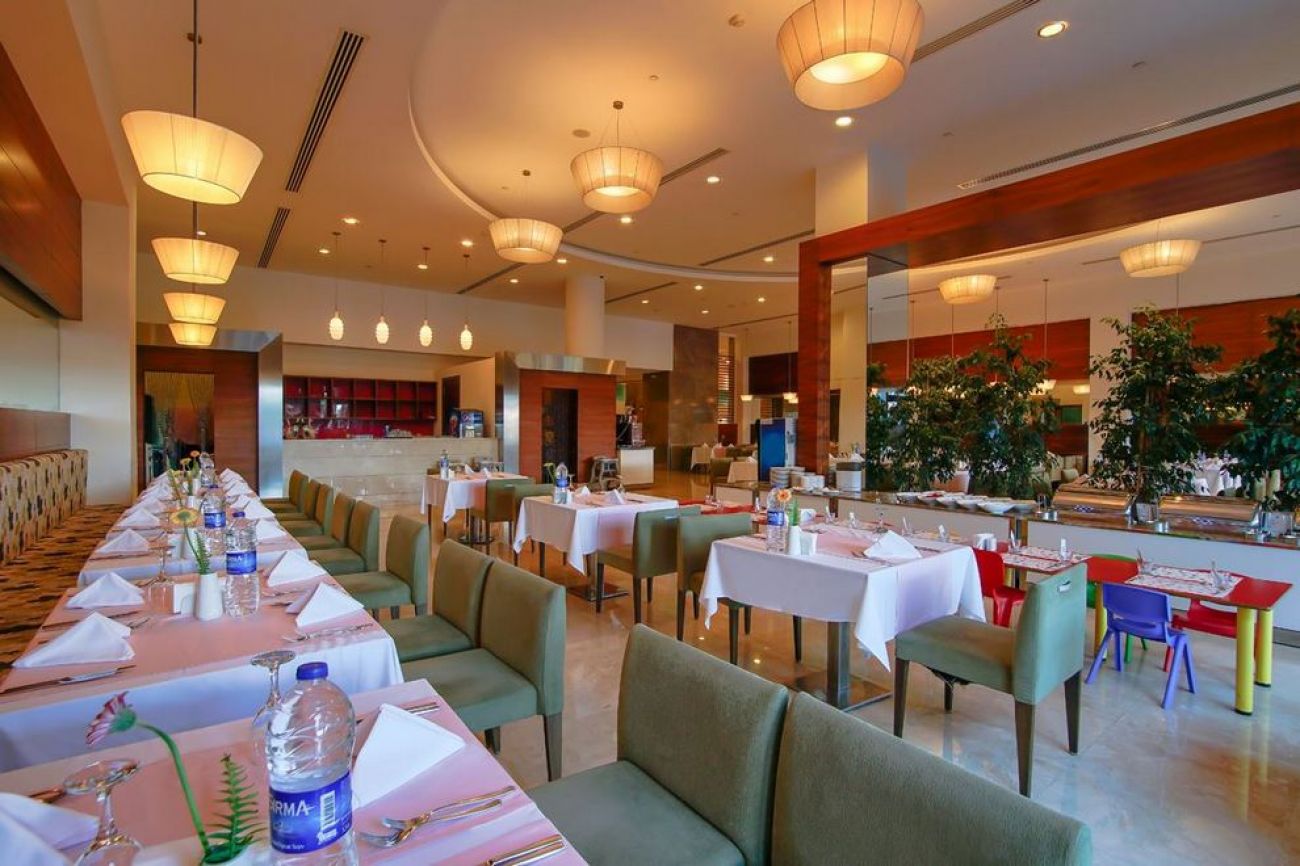 В основния ресторант се поднасят закуска, късна закуска, обяд, вечеря и среднощна закуска на шведска маса. Предлага се детско, вегетарианско и диетично меню. А`ла карт ресторантът AKDENİZ сервира средиземноморска кухня, има и Steak House.В четирите снек-ресторанта гостите могат да се подкрепят с леки закуски, а баровете поднасят разнообразни напитки.