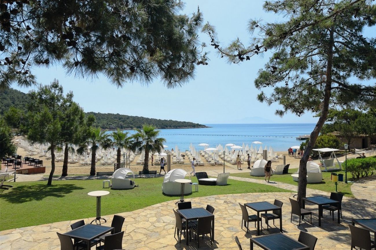 Собствен пясъчно-чакълест плаж, отличен със Син флаг и платформа. На разположение на гостите има 1 открит басейн с 5 водни пързалки и закрит басейн.